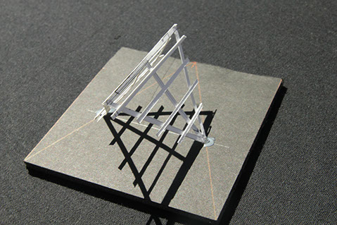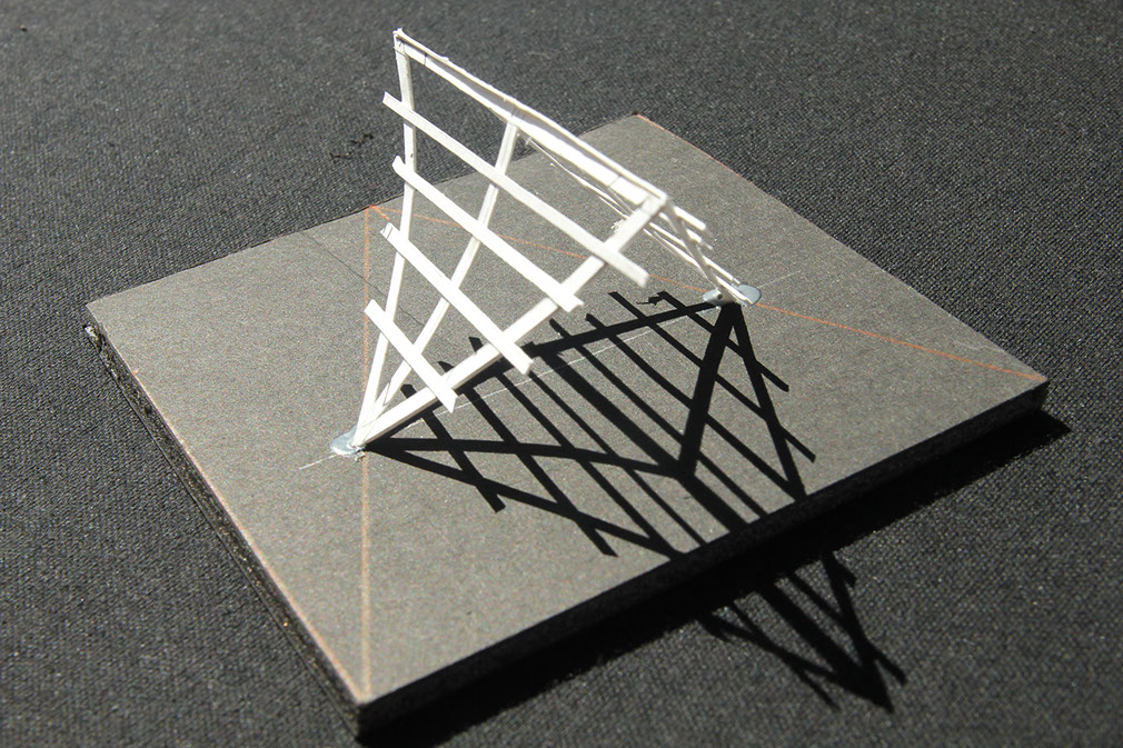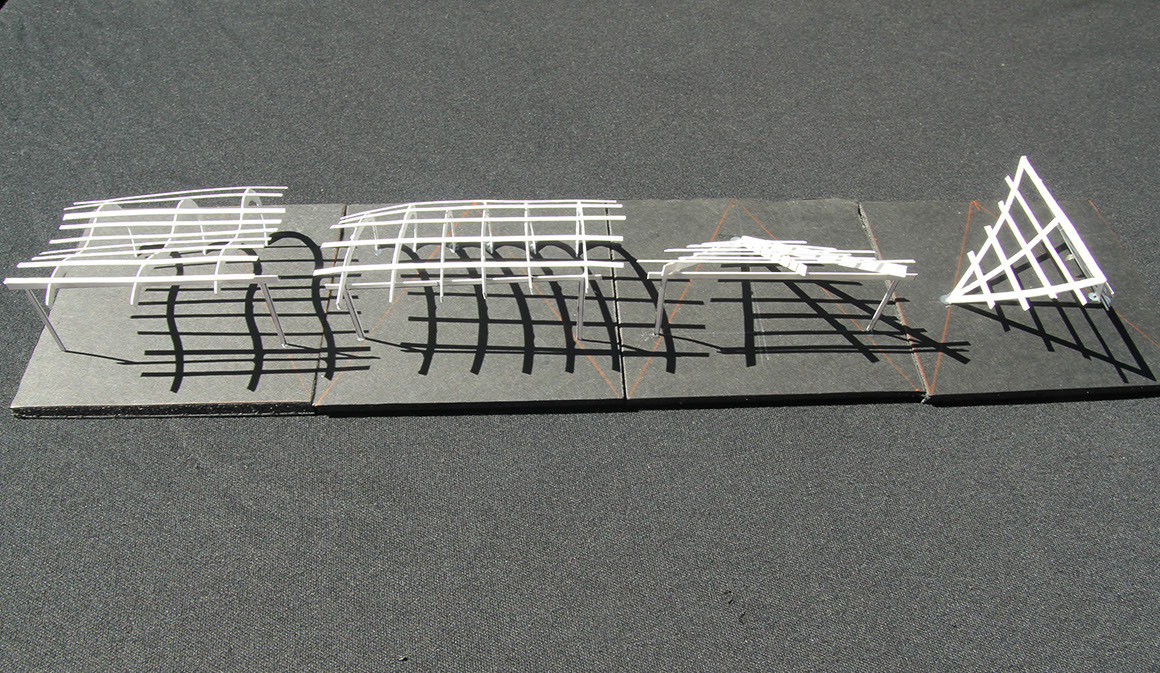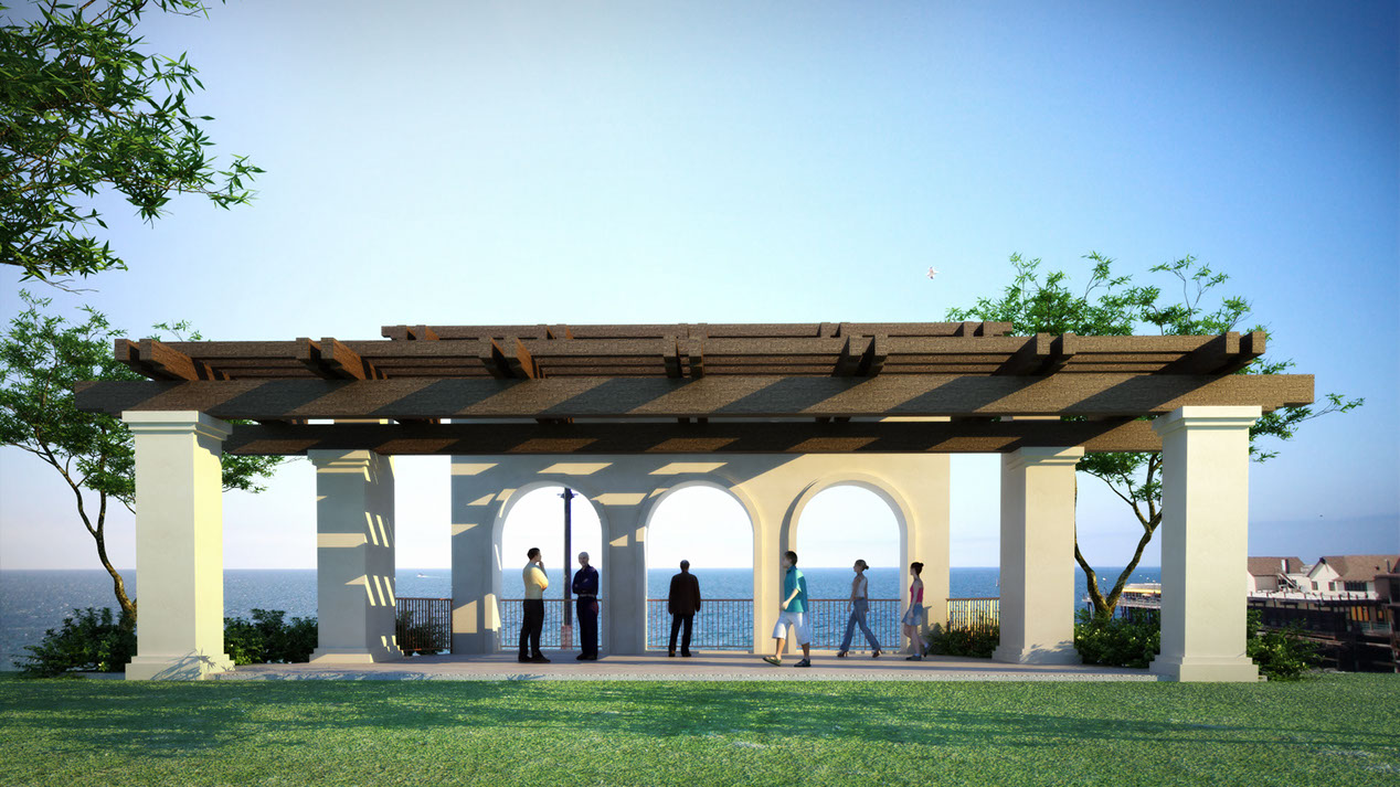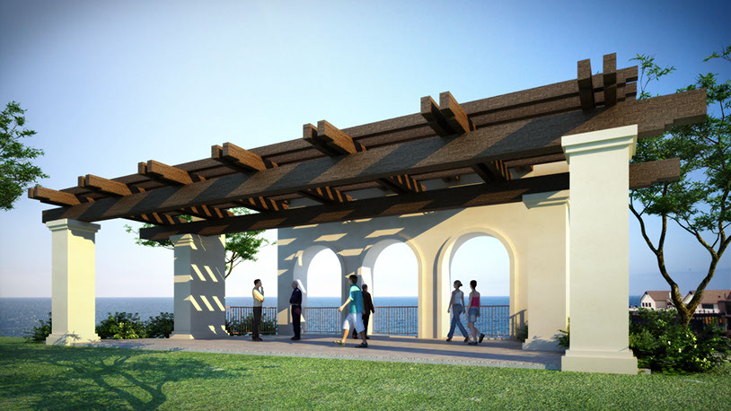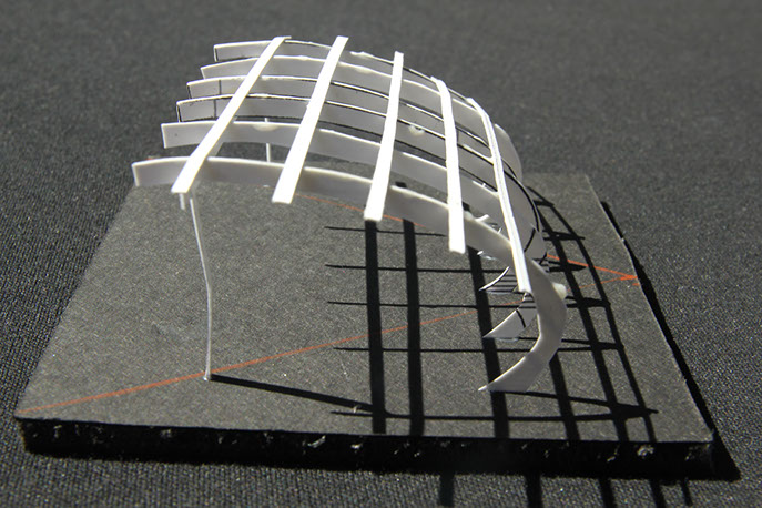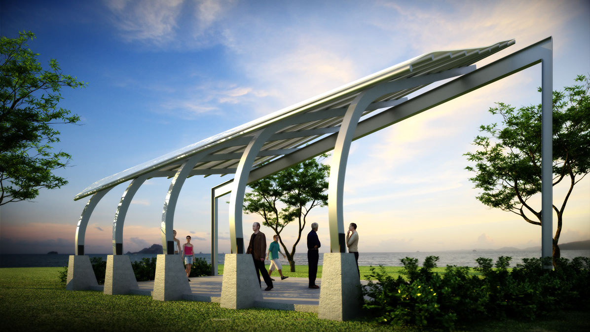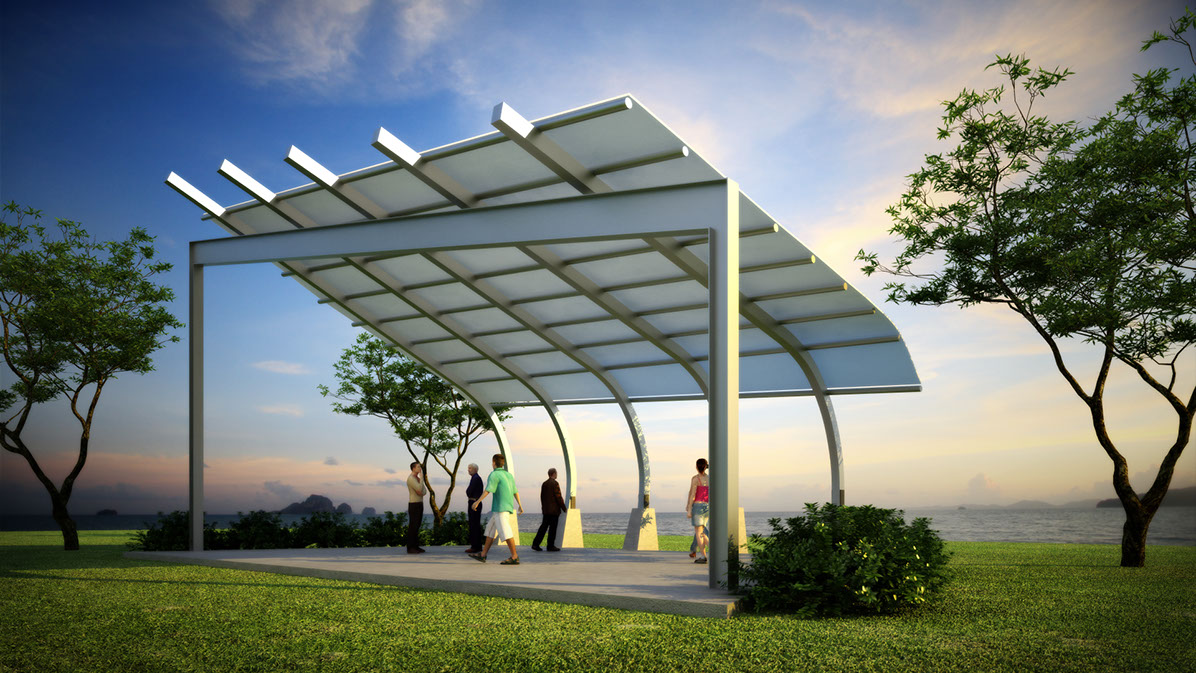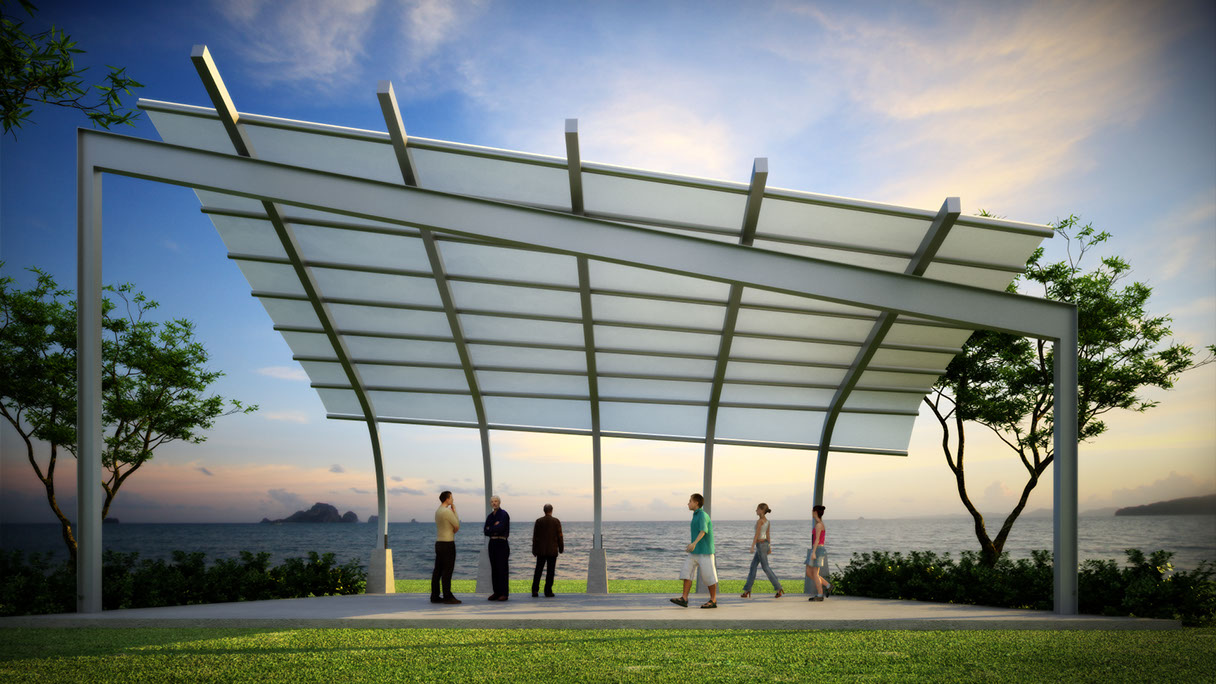 Nested at a park’s edge and in close proximity to the Pacific Ocean, this structure provides a setting for exterior performances while preserving the vistas. The structure is composed of four descending angled, recycled steel ribs, a sloping supporting steel rigid frame and a recycled tensile fabric cover.